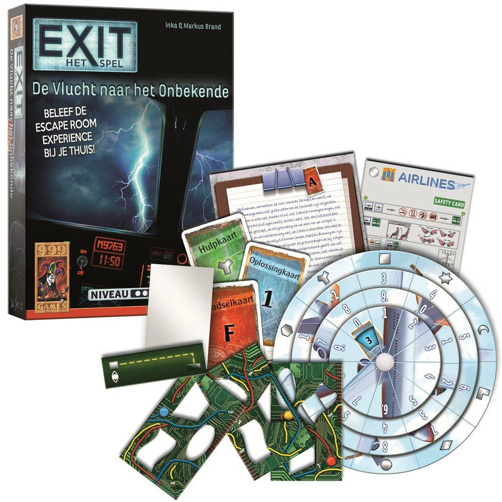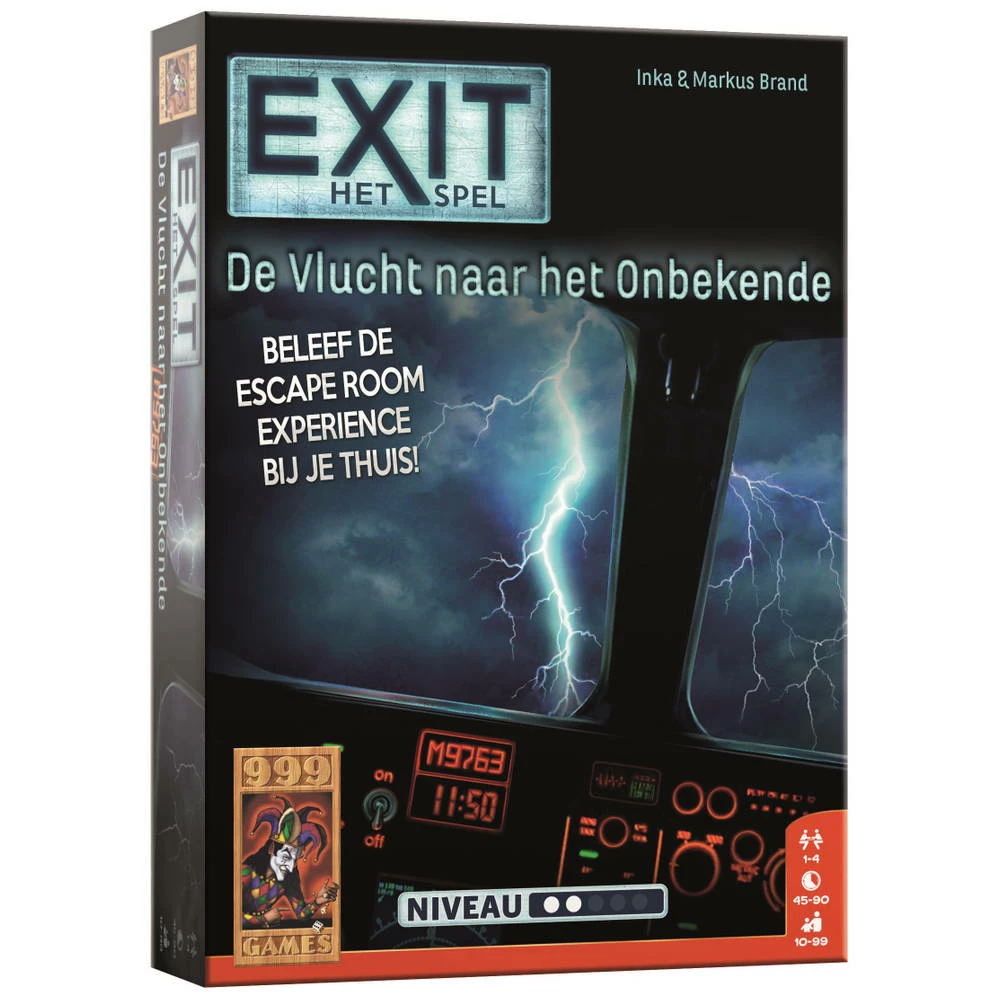 Exit: De vlucht naar het onbekende is een leuke manier om een escape-roomervaring te krijgen in het comfort van je eigen huis. Je maakt deel uit van een de bemanning van een vliegtuig dat is gecrasht in een storm. Het water begint stroomt naar binnen en alle systemen beginnen te falen. De tijd dringt, de enige manier om er levend uit te komen, is door puzzels op te lossen en codes te kraken die naar de reparatie van het vliegtuig en een veilige landing leiden. Geen tijd te verliezen, ga aan de slag en red jezelf en alle passagiers!