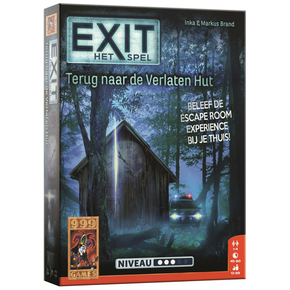 Beleef een dag vol actie met dit Exit: terug naar de verlaten hut spel. Op een dag word je gebeld door een rechercheur van de lokale politie: dr. Arthur Funbeq is ontsnapt! Aanwijzingen naar waar dit criminele meesterbrein zich ophoudt bevinden zich in een verlaten hut diep in een bos. Dit is dezelfde hut waar jij jezelf ooit uit hebt bevrijd. Alleen jij kunt helpen om dr. Arthur Funbeq achter de tralies te krijgen. Exit: terug naar de verlaten hut is een direct vervolg op de eerste Exit ooit. Opnieuw ga je naar de locatie van de verlaten hut om tal van puzzels op te lossen. Net als bij alle andere Exit-delen speelt ook hier de draaischijf een centrale rol. Door aan de hand van oplossingen van de raadsels codes te vinden en deze op de draaischijf in te voeren vind je de volgende stappen van dit spannende avontuur. Net als in een ‘echte’ escape room vormt dit spel een zeer intense puzzel- en speelervaring!