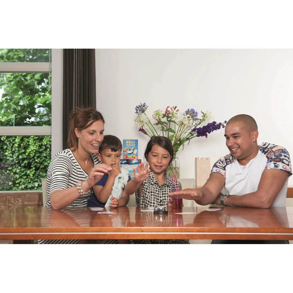 Bij dit leuke familiespel Halli Galli krijgt elke speler een gedekte stapel kaarten. Op elke kaart staan één of meer vruchten. Om beurten draait iedere speler een kaart om en legt deze op zijn eventueel eerder omgedraaide kaarten. Zo is voor iedere speler altijd maar één kaart zichtbaar. Als van een bepaalde vrucht precies 5 stuks zichtbaar zijn, moet je proberen zo snel mogelijk op de bel te drukken. Wie dat als eerste doet, krijgt alle open kaarten. Wie geen kaarten meer heeft, is uitgeschakeld. Wie blijft als laatste over?
