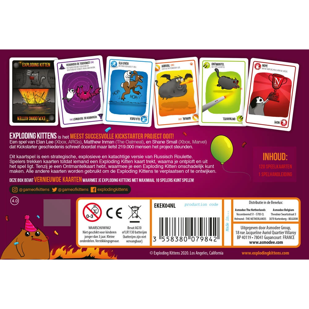 - Exploding Kittens Party Pack is een selectie van kaarten uit het basisspel, de expansie Imploding Kittens en de Exploding Kittens App.
