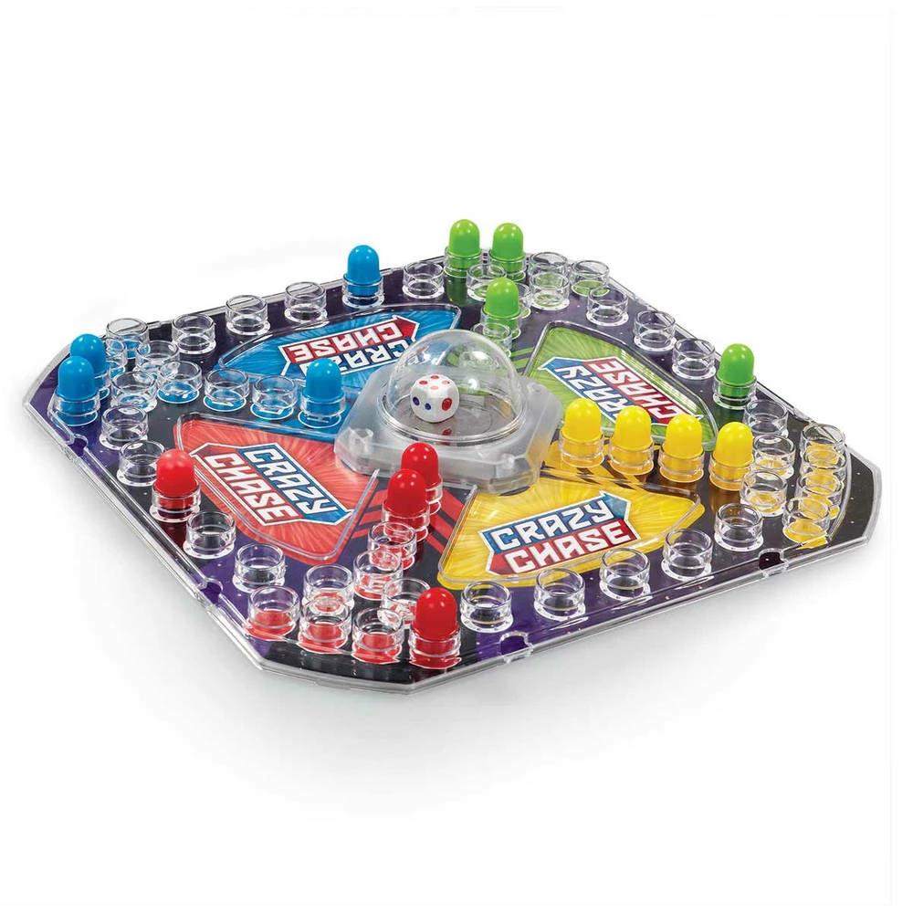 Crazy Chase is een spel dat je gek maakt als je de dobbelstenen gooit en je tegenstanders over het bord achtervolgt. Wie krijgt als eerste alle vier z’n haringen mee naar huis en wint het spel? Je zult behoorlijk geïrriteerd raken als andere spelers je haringen naar huis sturen zodat je helemaal opnieuw kunt beginnen.