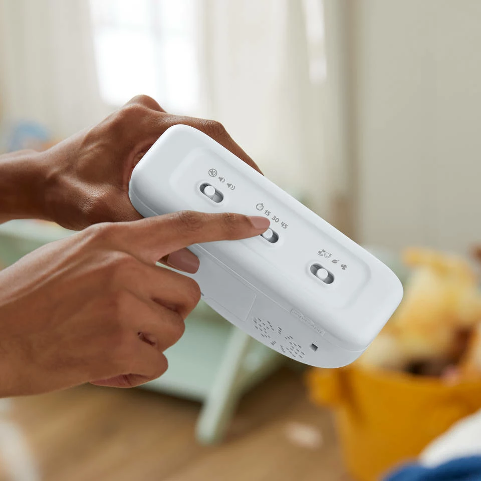 - Je hebt keuze tussen 15, 30 of 45 minuten durende natuurgeluiden, witte ruis of de speciaal ontwikkelde “ready, settle, sleep” afspeellijst.
