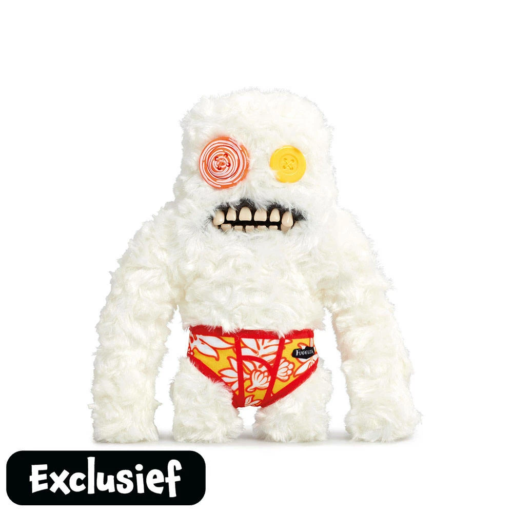 Ontmoet Sasquoosh, een witte zachte Fuggler. Hij lijkt heel schattig in zijn tropisch onderbroekje, maar schijn bedriegt Sasquoosh is een echt monster. Kleine tip: laat hem niet in de buurt van de koelkast komen, want als je even niet kijkt gaat hij er zo vandoor met al je eten en kan je gelijk opzoek gaan naar een nieuwe koelkast. Zijn hobby’s: koelkasten slopen, met andere knuffels gooien en jou het leven zuur maken.