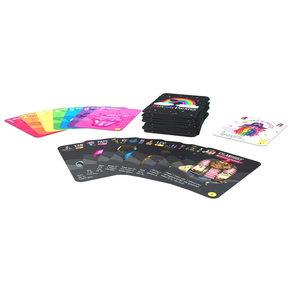 Rainbow Pirates is een kaartspel waarin je kaartreeksen bouwt in een wereld van regenbogen en stelende piraten. Het doel van Rainbow Pirates is om zoveel mogelijk punten te verdienen door kaartgroepen op je eiland te plaatsen. Je kunt je tegenstanders echter ook aanvallen met piratenkaarten of ze gebruiken om jezelf voordelen te geven. Bij het spel Rainbow Pirates krijg je het gevoel dat je op een betoverd eiland zit terwijl je aangevallen wordt door piraten. Rainbow Pirates combineert plezier met strategie en is een uitdagend spel geschikt voor een gezellige avond met familie of vrienden.
