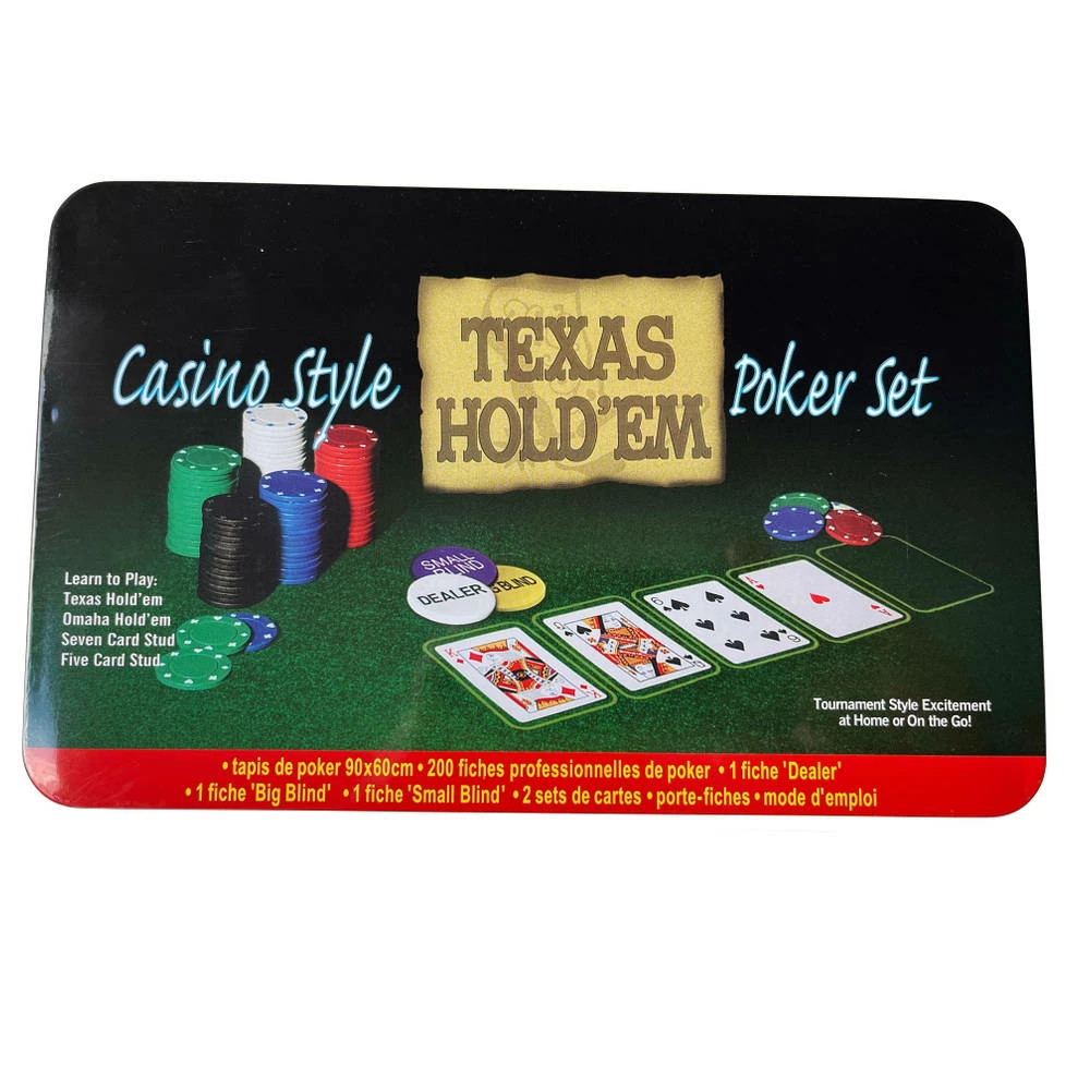 - De set bevat verschillende accessoires waaronder een mat van 90 x 60 cm, 200 pokerchips, een ‘Dealer’, een ‘Big Blind’ en een ‘Small Blind’ formulier, twee sets speelkaarten, een kaarthouder en instructies.
