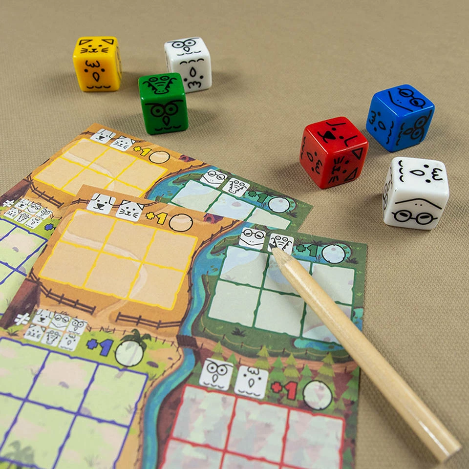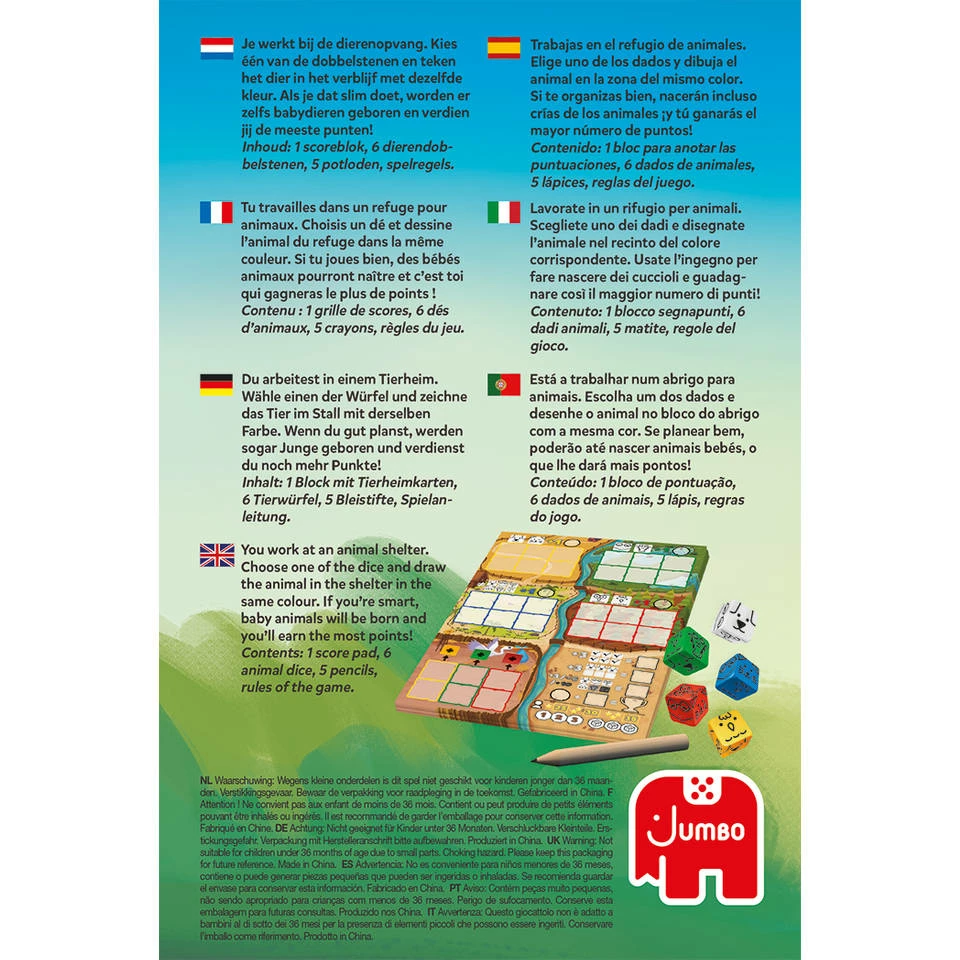 - Inhoud: 1 scoreblok, 6 dierendobbelstenen, 5 potloden, spelregels.