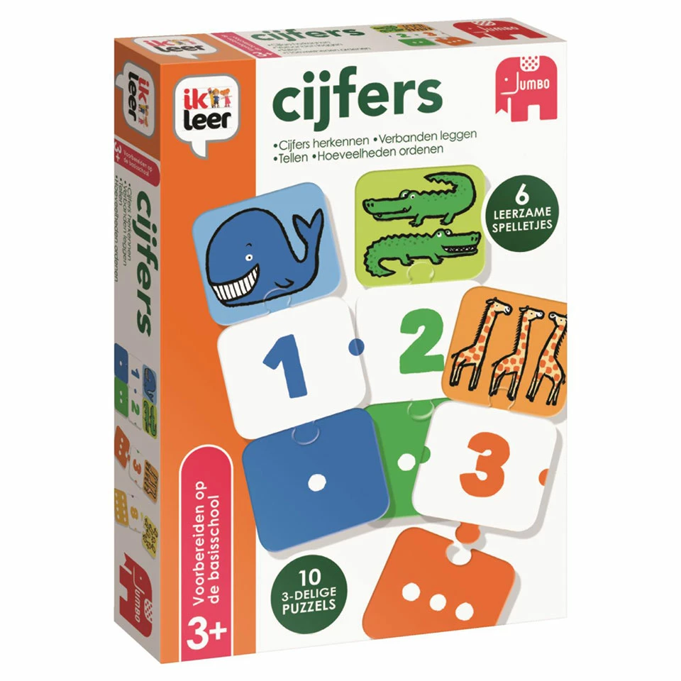 Deze Jumbo doos bevat zes superleuke spelletjes om te leren tellen van één tot tien. Met deze spellen leren kleintjes cijfers herkennen, tellen, hoeveelheden ordenen en verbanden leggen. Leg de dierenreeks van klein naar groot. Zie jij hoeveel dieren er op de kaart staan? Puzzel dan het juiste getal eraan vast. Het spel bevat tien driedelige puzzels met de cijfers 1 tot en met 10. De spelletjes lopen op in moeilijkheidsgraad en zijn zelfcorrigerend.