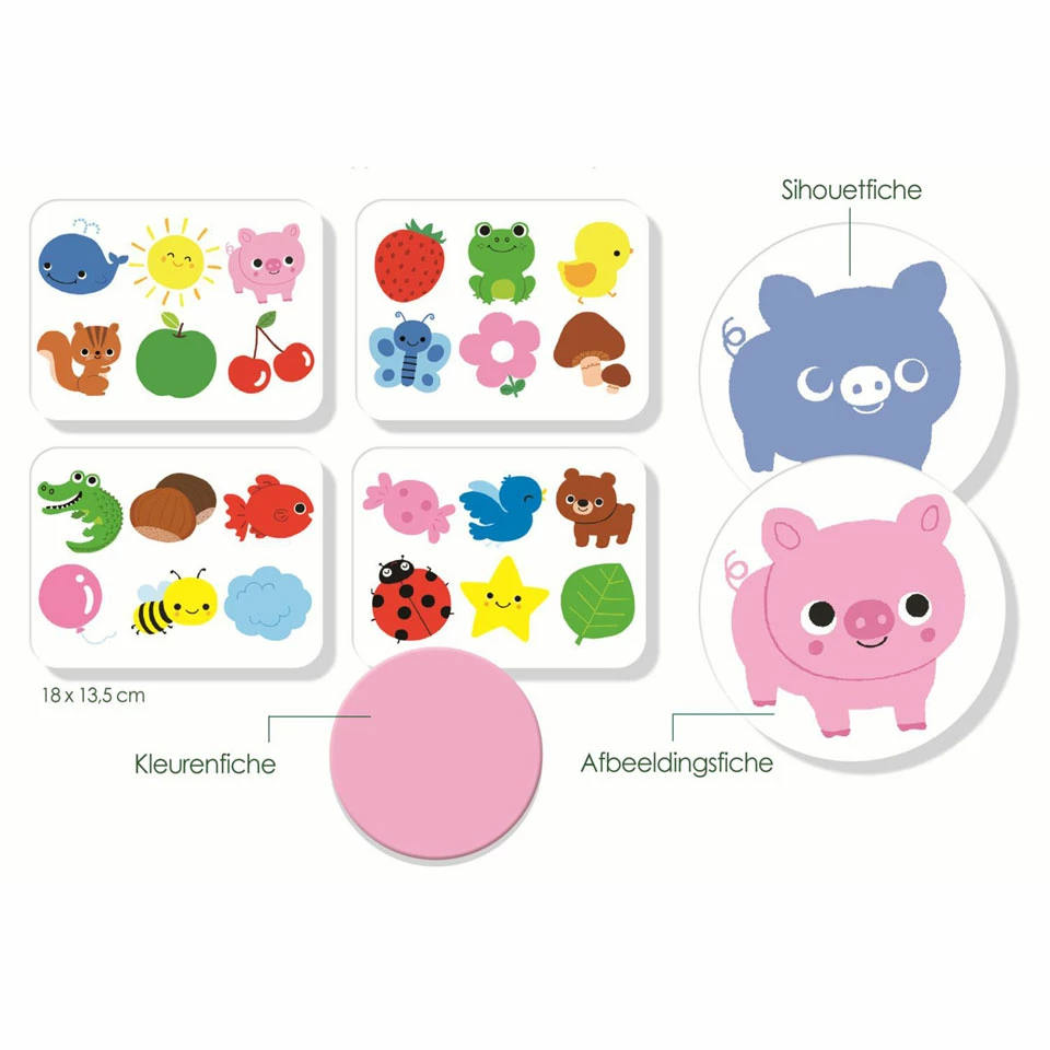 Leer met behulp van de zes spelletjes alles over vormen en kleuren. Met de spelletjes leren kinderen spelenderwijs kleuren benoemen, vormen en silhouetten herkennen, de woordenschat vergroten en verbanden leggen. Kan jij een afbeeldingen met dezelfde vorm of kleur vinden? Maak zo de grote lottokaart compleet. Het spel bevat 4 dubbelzijdige lotto kaarten en 48 fiches. De spelletjes lopen op in moeilijkheidsgraad.