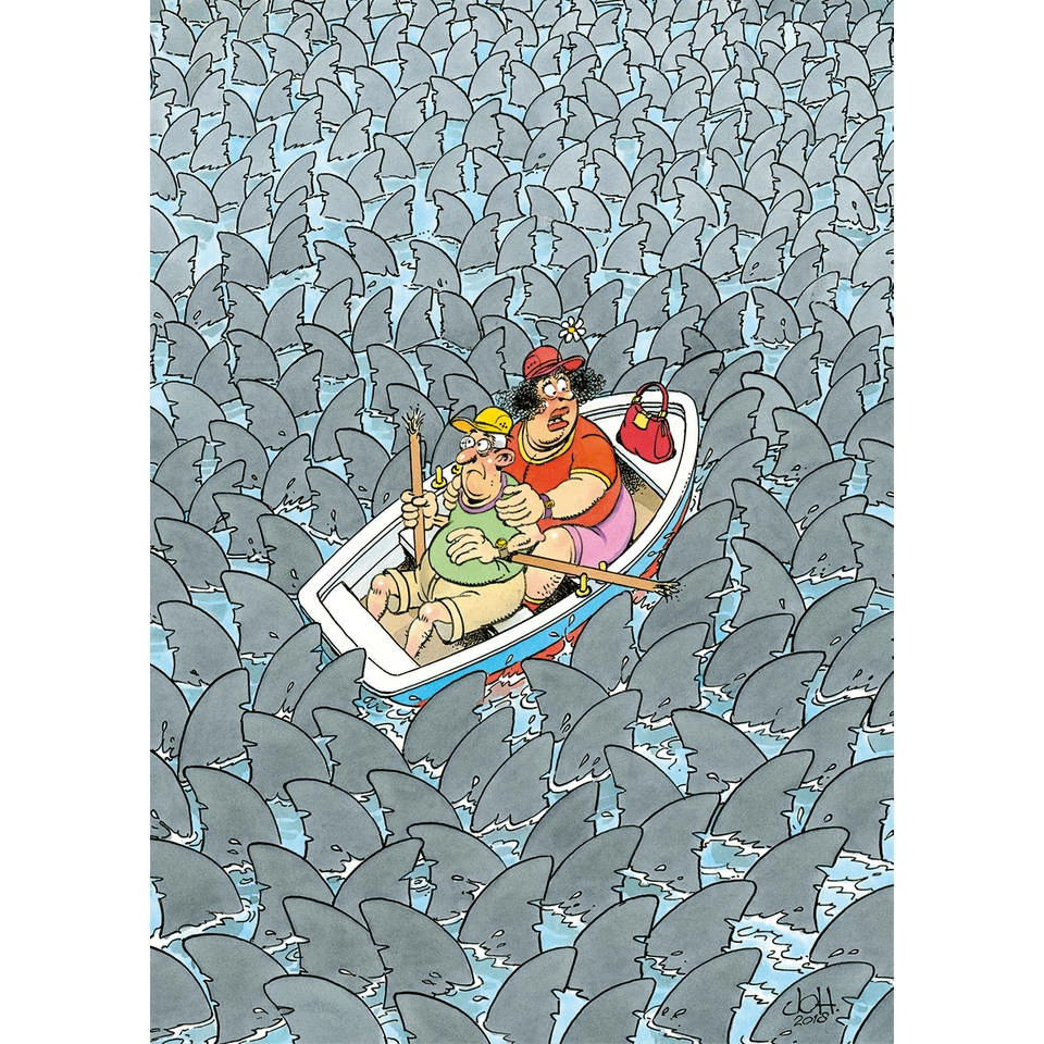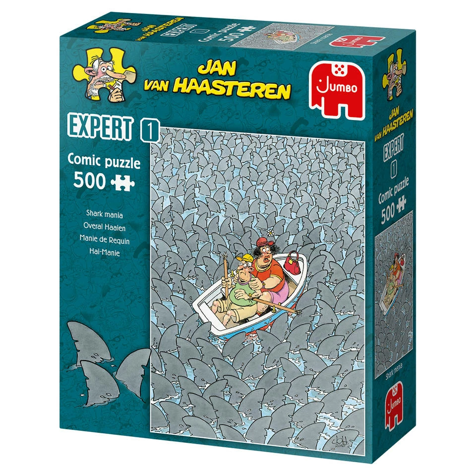 Schoonmoeder en schoonvader hebben een roeiboot gehuurd om een rustige dag op het water door te brengen, maar het loopt niet helemaal zoals ze hadden verwacht! Houden ze het hoofd koel in deze haai waanzin? Jan van Haasteren Expert puzzles zijn uitdagende, grappige illustraties, in een comfortabel 500 stukjes formaat. Een must-have voor alle puzzelfans. Eén of twee beroemde karakters uit de familie gaan op hun eigen kleine avontuur. Laat je niet voor de gek houden en wees voorbereid op het expert niveau in puzzelen! Een Jan van Haasteren puzzel is meer dan een gewone legpuzzel: het is een avonturenserie, met vertrouwde hoofdrolspelers in een eindeloos decor vol absurde details. Ontdek alle doldwaze avonturen van de Jan van Haasteren-familie.