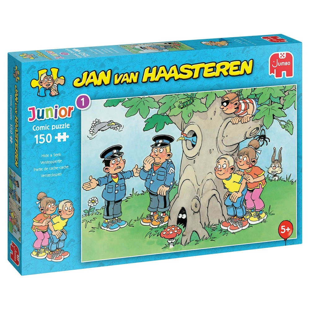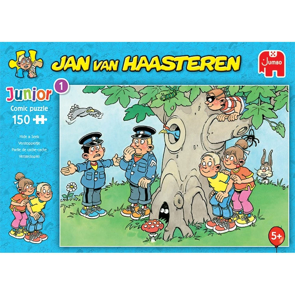 1, 2, 3 wie niet weg is, is gezien! Deze Jumbo Jan van Haasteren Junior puzzel Verstoppertje bestaat uit 150 stukjes.