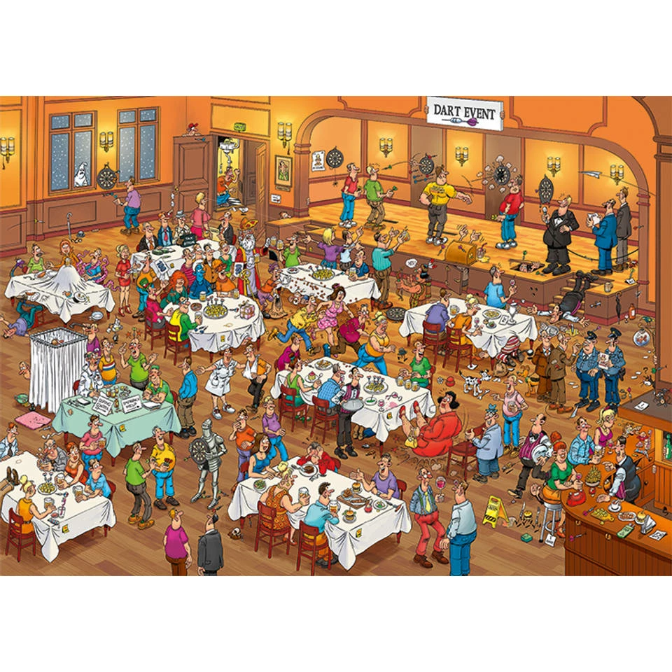 - Op de puzzel staat een mooie afbeelding van vreemde en leuke situaties op het darttoernooi.
