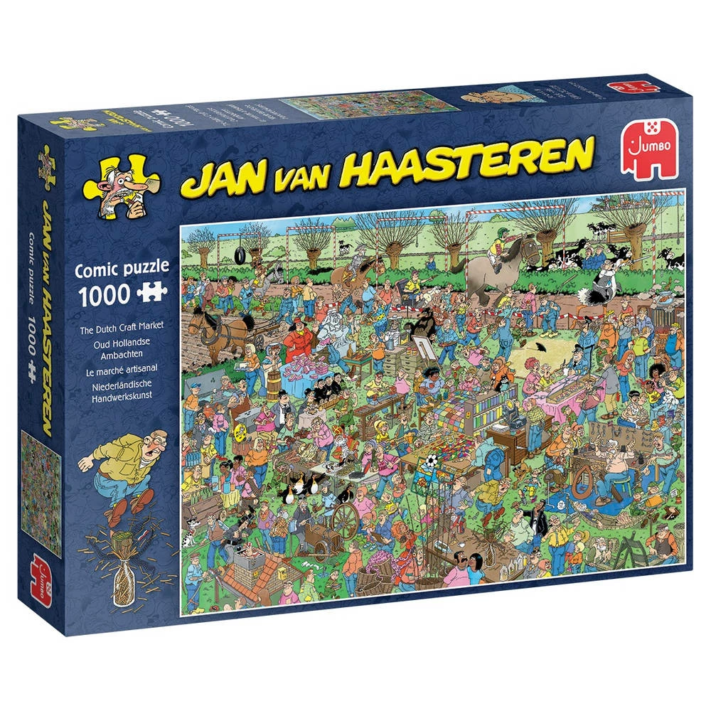 Zie welke vreemde en leuke situaties er allemaal plaatsvinden op de markt voor Oud Hollandse Ambachten met deze Jumbo Jan van Haasteren puzzel. De puzzel bestaat uit 1000 stukjes.