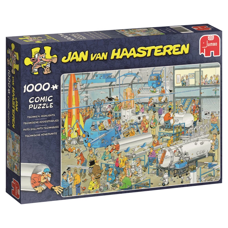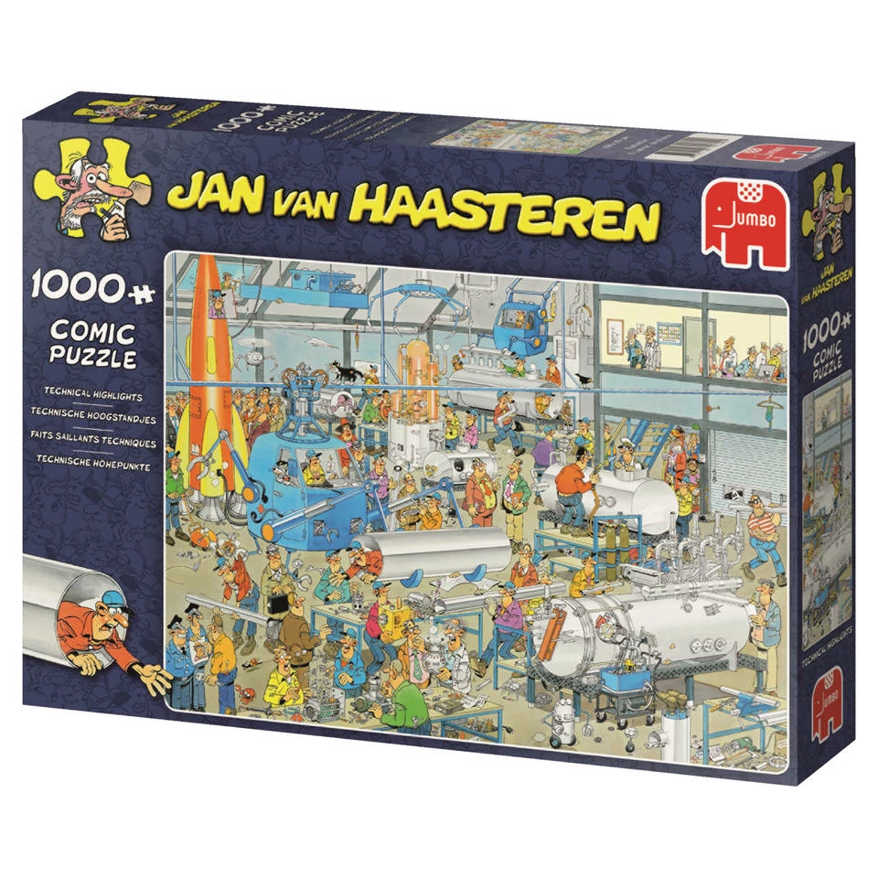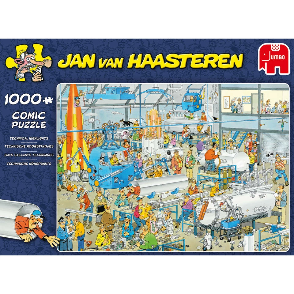 Op deze Jan van Haasteren puzzel van Jumbo met een afbeelding van een drukke fabriekshal kom je een heleboel verrassingen tegen. Van verstopte dieren en politieagenten tot een echte raket.