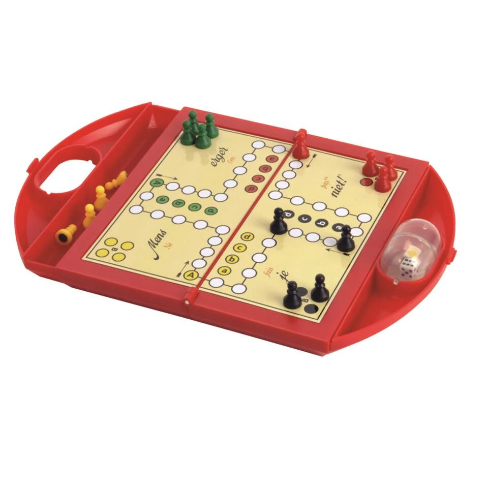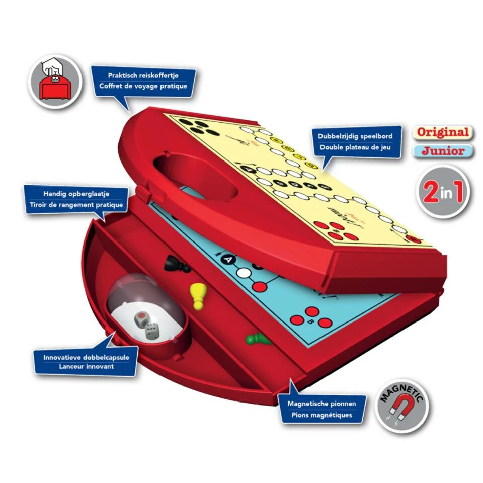 - Met magnetische pionnen en innovatieve dobbelcapsule.
