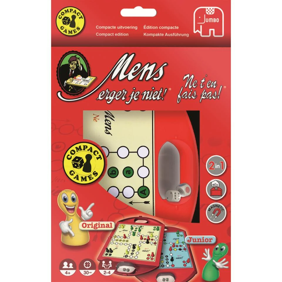 Nu heb je Jumbo Mens erger je niet! original en junior in één doos! Deze set bevat een dubbelzijdig speelbord in een handige travelcase.