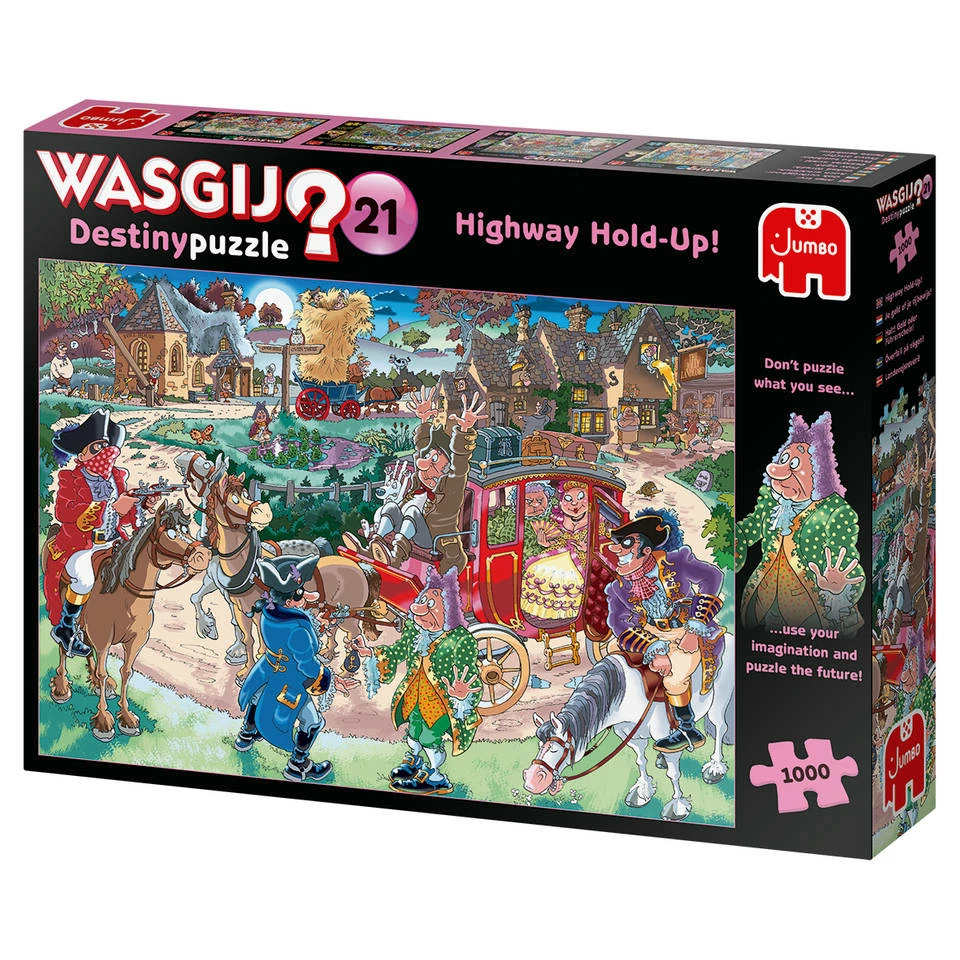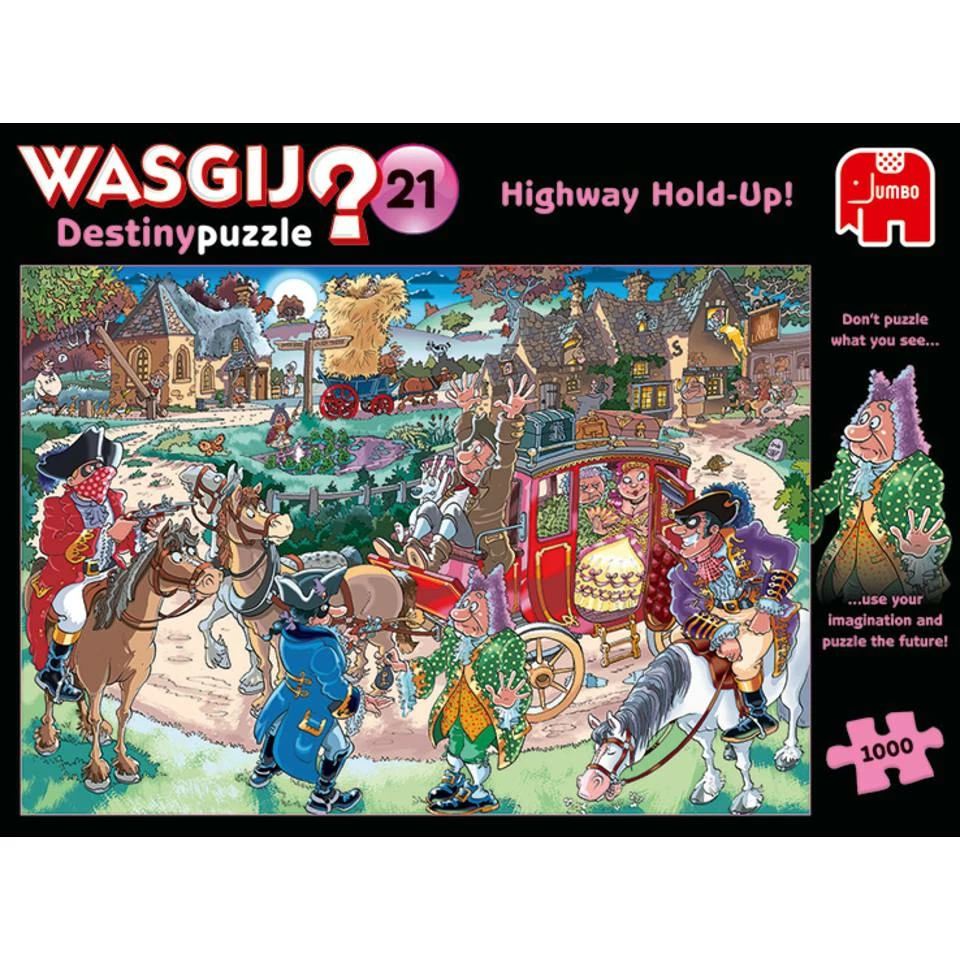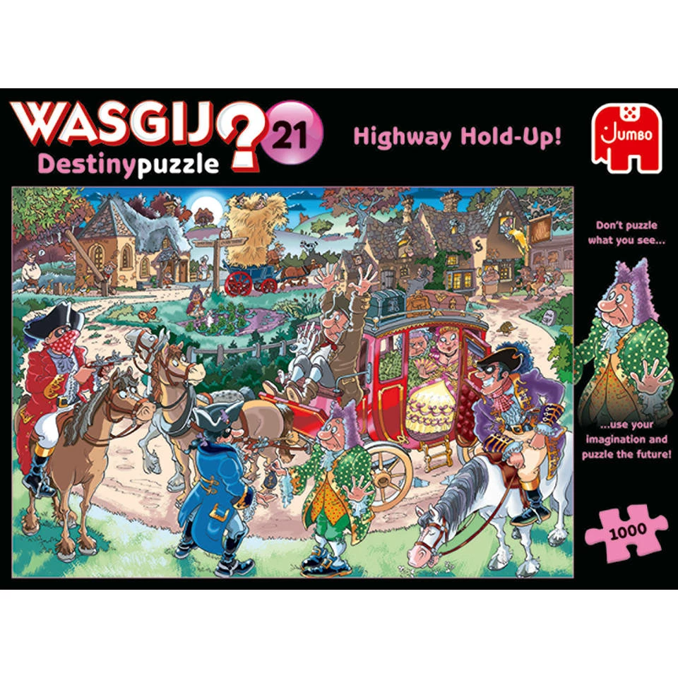 Ga snel aan de slag met deze uitdagende Jumbo Wasgij Destiny 21 puzzel. Leg alle puzzelstukjes op de juiste plaats en kijk hoe een prachtige afbeelding tevoorschijn komt. De afbeelding op de doos is niet het plaatje dat je legt! In Wasgij Destiny reis je naar de toekomst. ‘Je geld of je rijbewijs!’ is de titel van deze puzzel. Deze mooie puzzel bestaat uit 1000 stukjes van stevig karton.