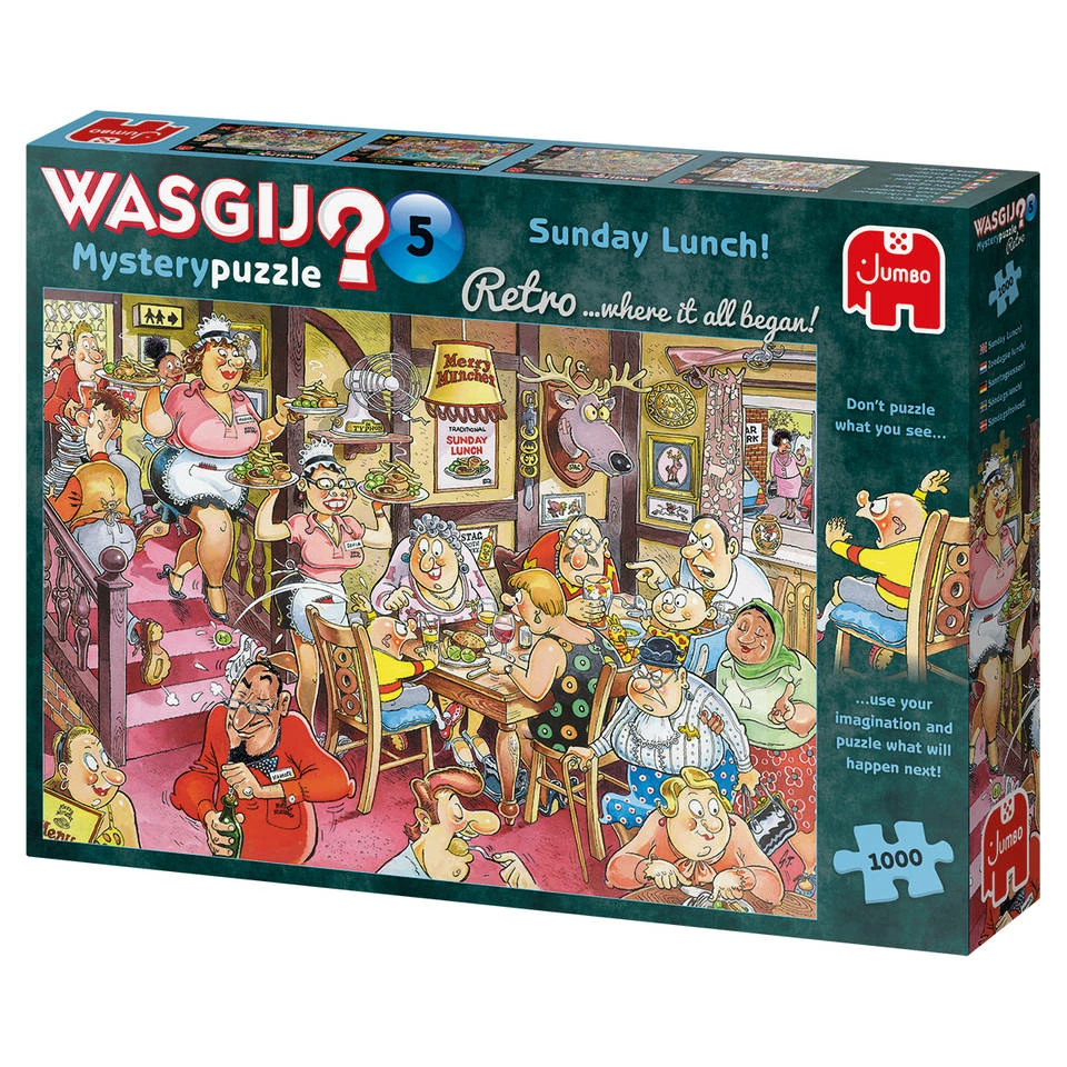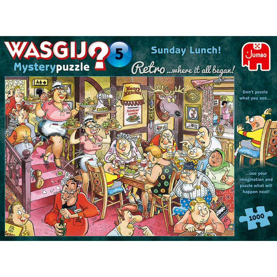 Als je deze Jumbo Wasgij Retro Mystery 5 puzzel af heb ontdek je een mooie afbeelding van een zondagse lunch. De puzzel bestaat uit 1000 stukjes.