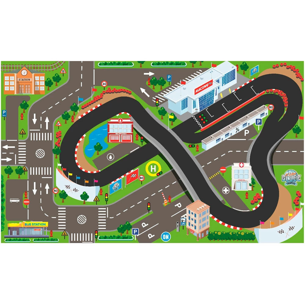 Race door de straten van de stad op dit Kids Globe circuit speelkleed. Na de race kan je de normale weg pakken om even een bezoek te brengen aan het zieken huis of ga even tanken bij het tankstation. Het speelkleed heeft ook LED-lampjes waardoor je gebruik kunt maken van de verkeerslichten.