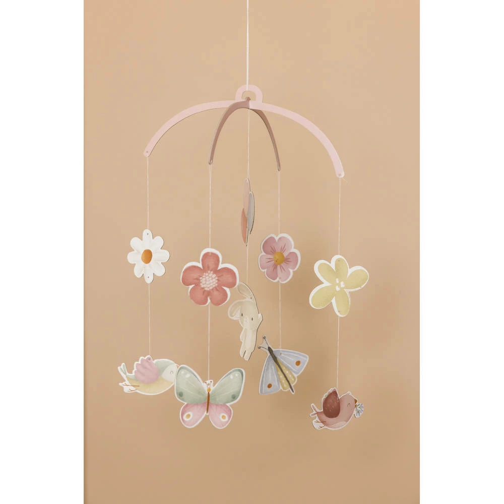 - Aan de mobiel hangen tien kartonnen figuurtjes in Flowers & Butterflies-thema om te ontdekken en te bewonderen.