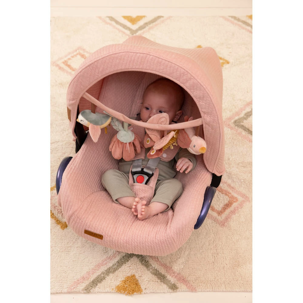 Aan de Little Dutch Flowers & Butterflies wagenspanner in vrolijk bloemen- en vlinderthema hangen vier speeltjes voor jouw baby om naar te kijken en vast te pakken.
