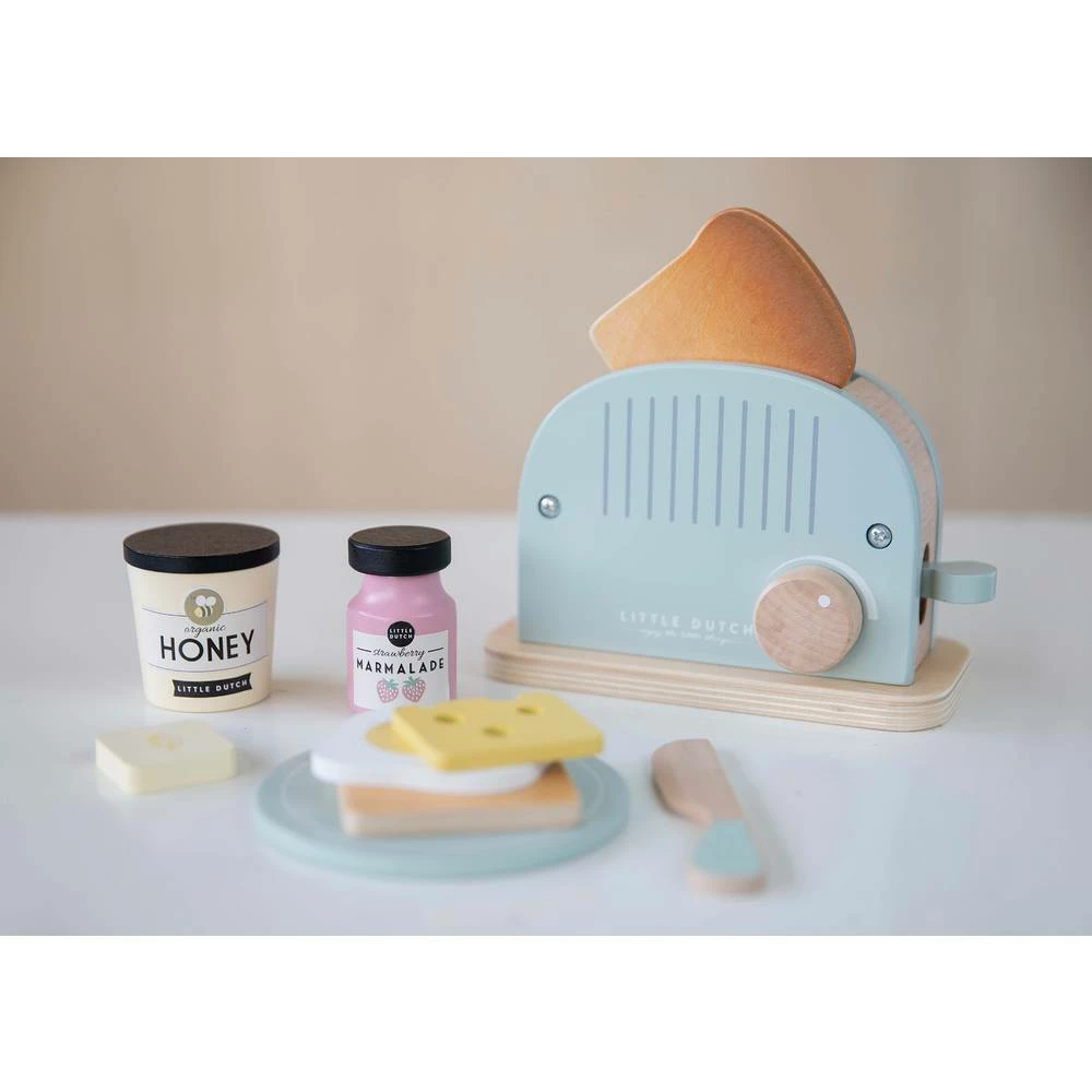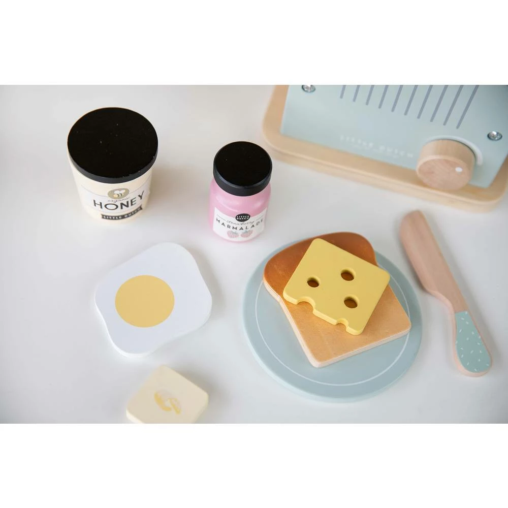 Een goed begin van de dag begint met een goed ontbijt! Deze Little Dutch houten broodrooster is perfect om een goed ontbijtje op tafel te toveren. Leg het broodje in het broodrooster en druk op de hendel om deze eruit te laten springen. Het broodrooster wordt geleverd met een bordje, mesje, twee boterhammen, potjes honing, jam, een spiegelei en een plakje kaas.