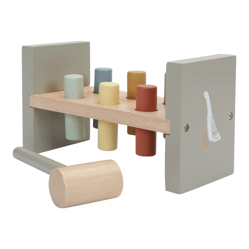 Met deze groene hamerbank Little Goose van Little Dutch kunnen kinderen heerlijk spelen. Tik tik tik! Gebruik de hamer om de zes gekleurde staafjes in het houten hamerbankje te timmeren. Dit is een goede oefening voor de motoriek van je kindje. Zijn alle staafjes erin geslagen? Draai het bankje om en begin opnieuw!