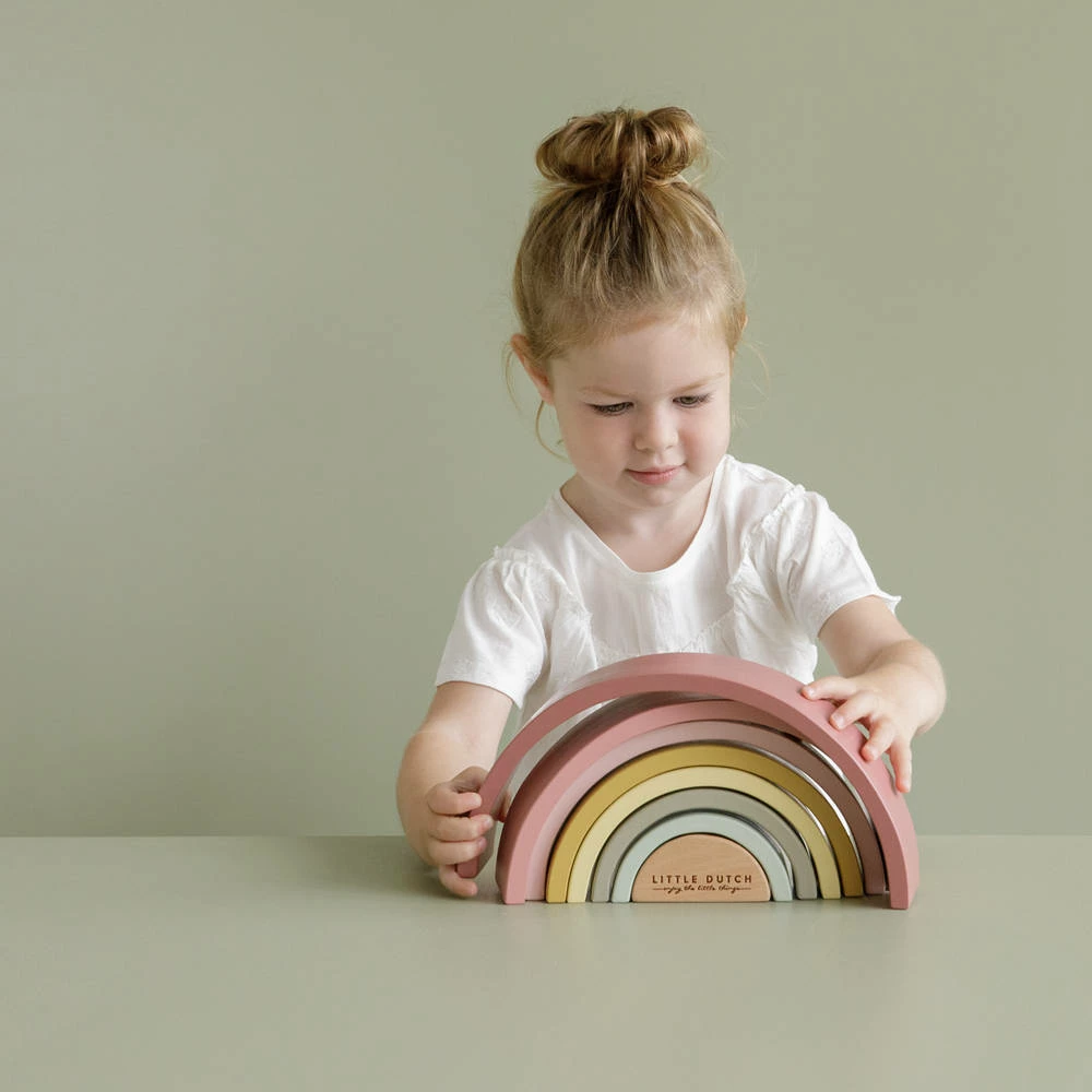 Al spelend leren met deze roze Little Dutch regenboog. Deze houten stapeltoren heeft de vorm van een prachtige regenboog.