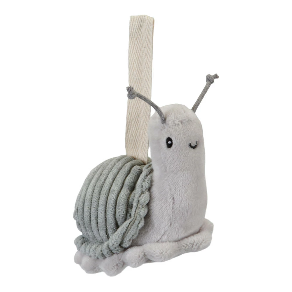 Little Goose heeft knisperende vleugels, de slak is versierd met een spiegeltje, de kikker maakt een schattig piepje, de bloem is een rammelaar en het bijtje laat haar belletje klinken als ze een klein duwtje krijgt.
