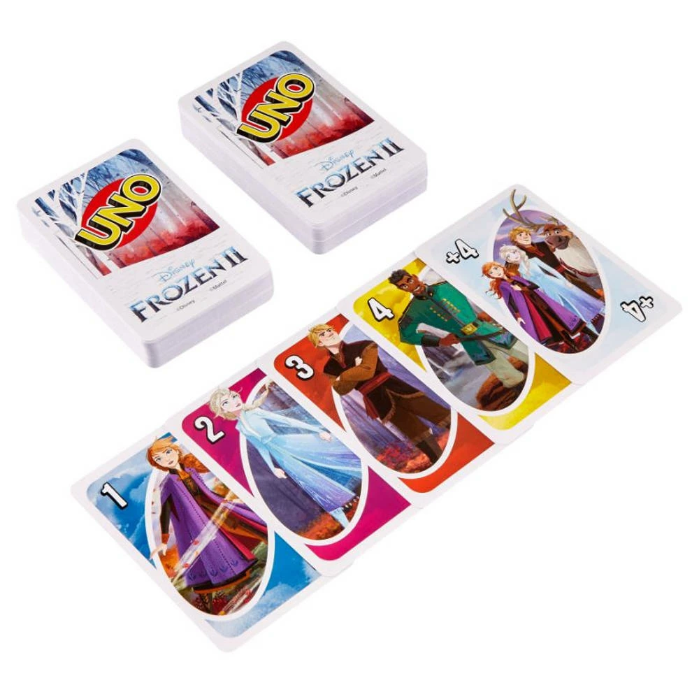 Speel UNO nu in speciale Frozen-uitvoering! UNO is het klassieke kaartspel dat draait om overeenkomstige kleuren en cijfers. Het spel dat je gemakkelijk leert en waar je niet genoeg van krijgt, wordt nu extra spannend met Eigen-regels kaarten! De spelers proberen zo snel mogelijk al hun kaarten uit te spelen door een bijpassende kaart in hun hand op de bovenste kaart van de stapel te leggen. Met de speciale actiekaarten kun je het spel veranderen en je tegenspelers sneller verslaan! Gebruik de kaart ‘Kaarten ruilen’ om je hand kaarten te ruilen met een andere speler en schrijf je eigen regels op de drie beschrijfbare (en wisbare) Eigen-regels-kaarten!Â