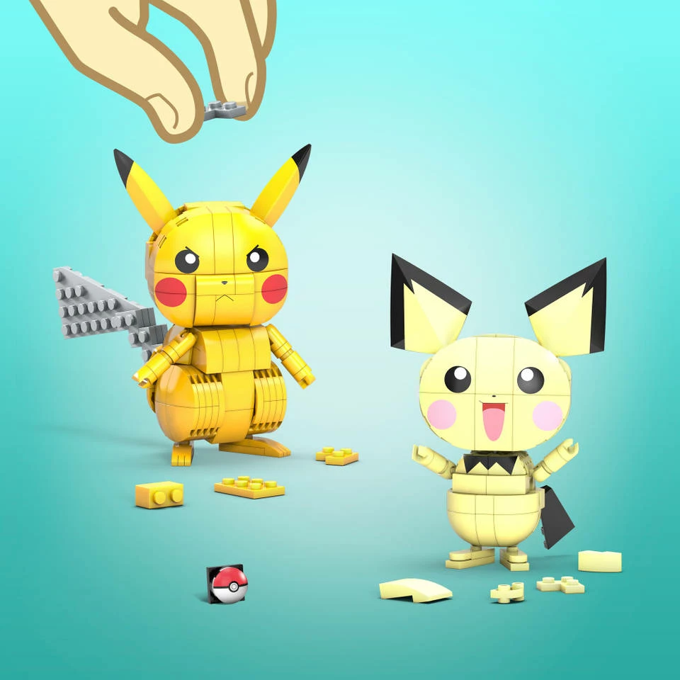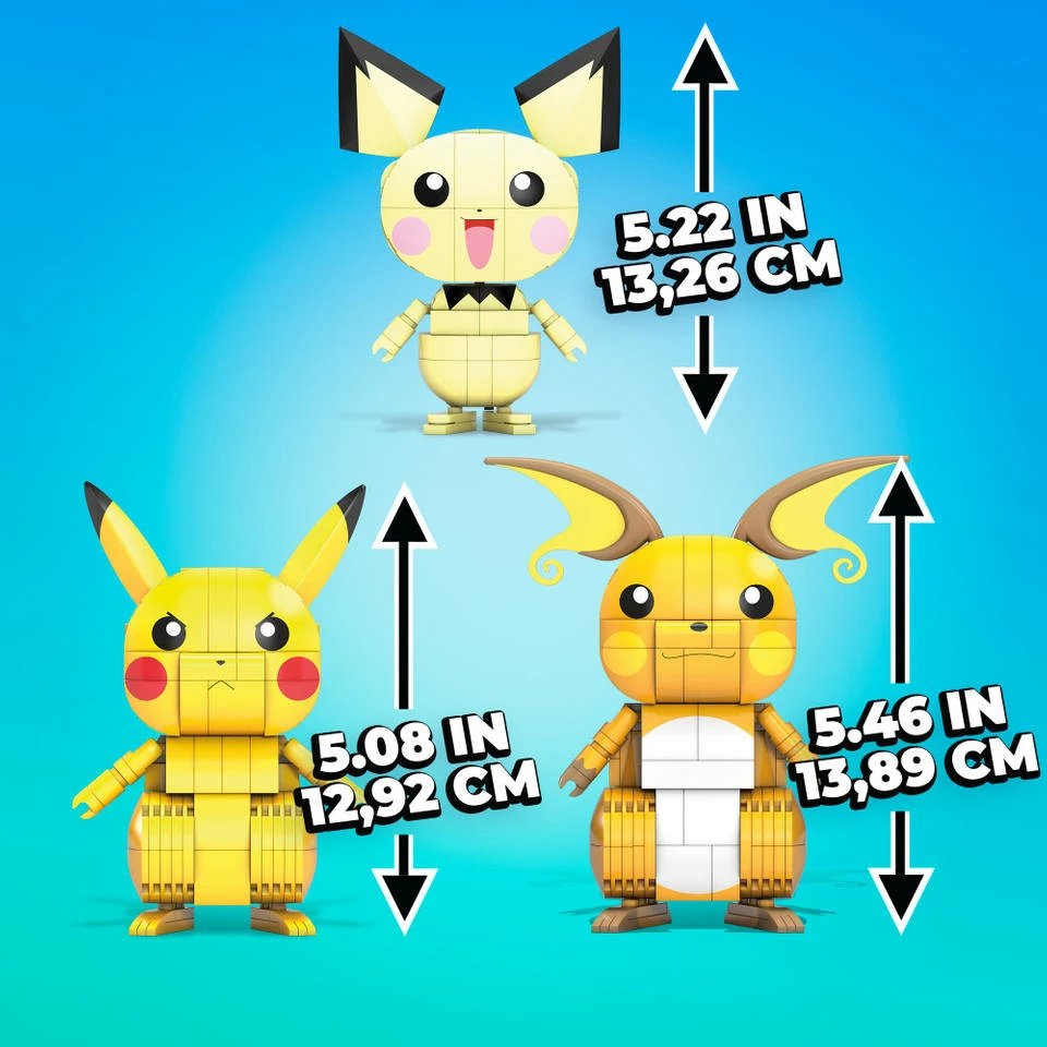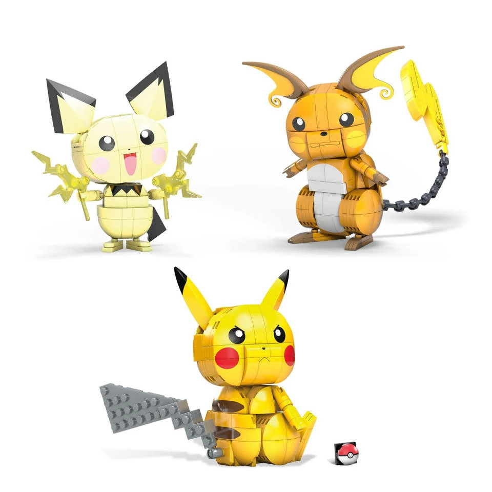 Bouw 3 beweegbare Pokémon figuren van Pichu, Pikachu en Raichu met deze Mega Construx Pokémon evolutie van Pikachu bouwset.