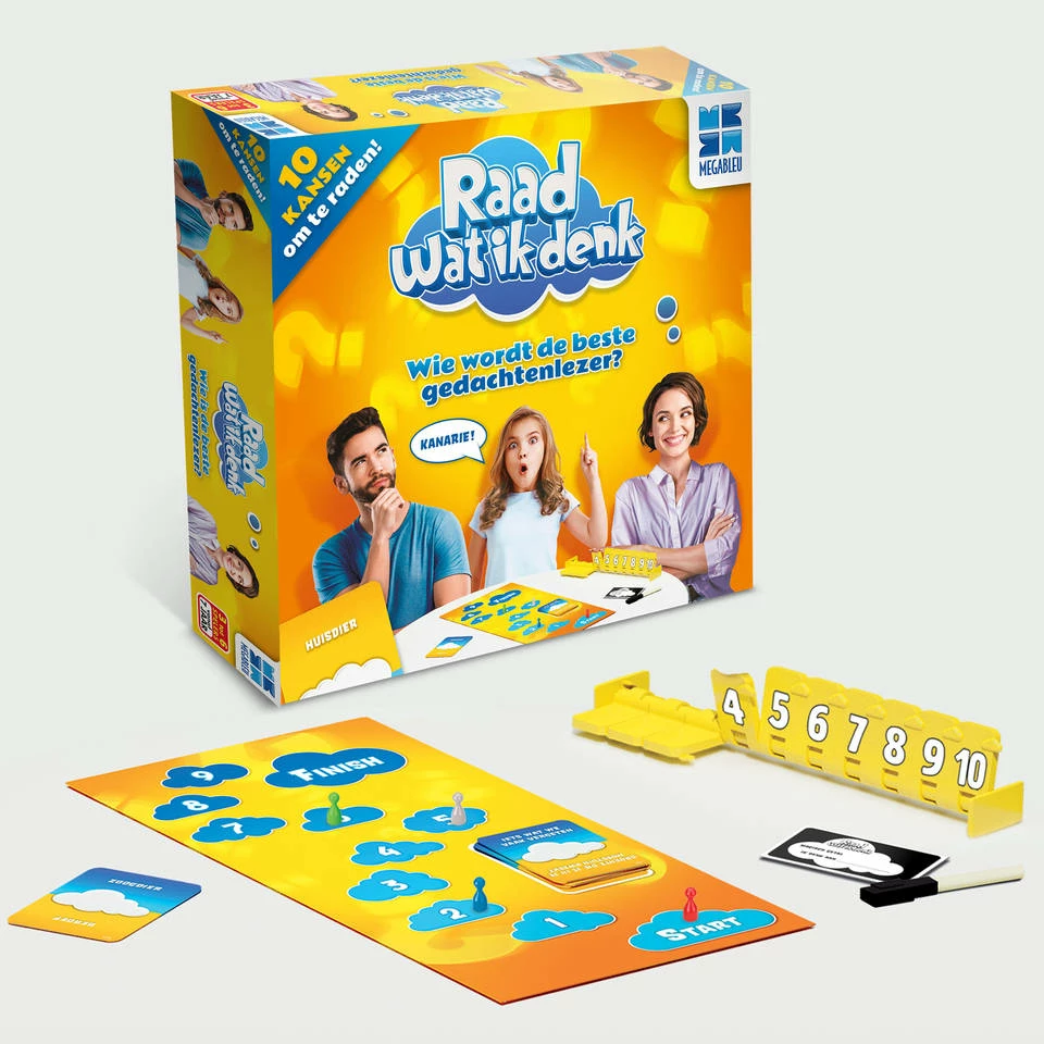 Kun jij raden wat ik denk? Raad snel, maar niet te snel… Raad het precies goed! Aan welk dier denk ik nu? De andere spelers moeten hier achter zien te komen. Maar jij moet ook inschatten hoe vaak de anderen moeten raden om tot de oplossing te komen die jij stiekem hebt opgeschreven. Minder dan 3 pogingen? Slecht voor jou, geen punten! Tussen 3 en 10 pogingen? Punten voor jou en degene die het geraden heeft! Pak een categoriekaart en schrijf in het geheim het woord op waaraan je denkt, samen met het aantal beurten dat de andere spelers volgens jou nodig hebben om het woord te raden. Het woord mag niet te moeilijk zijn om te raden, maar ook niet te eenvoudig. Probeer een woord te bedenken dat andere spelers niet in de eerste 3 beurten zullen raden, maar wel voor de 10e beurt! Spelers mogen hun pion op het speelbord verplaatsen volgens het aantal beurten dat ze nodig hadden om het woord te raden. Wie bereikt als eerste de finish en is de beste gedachtelezer?