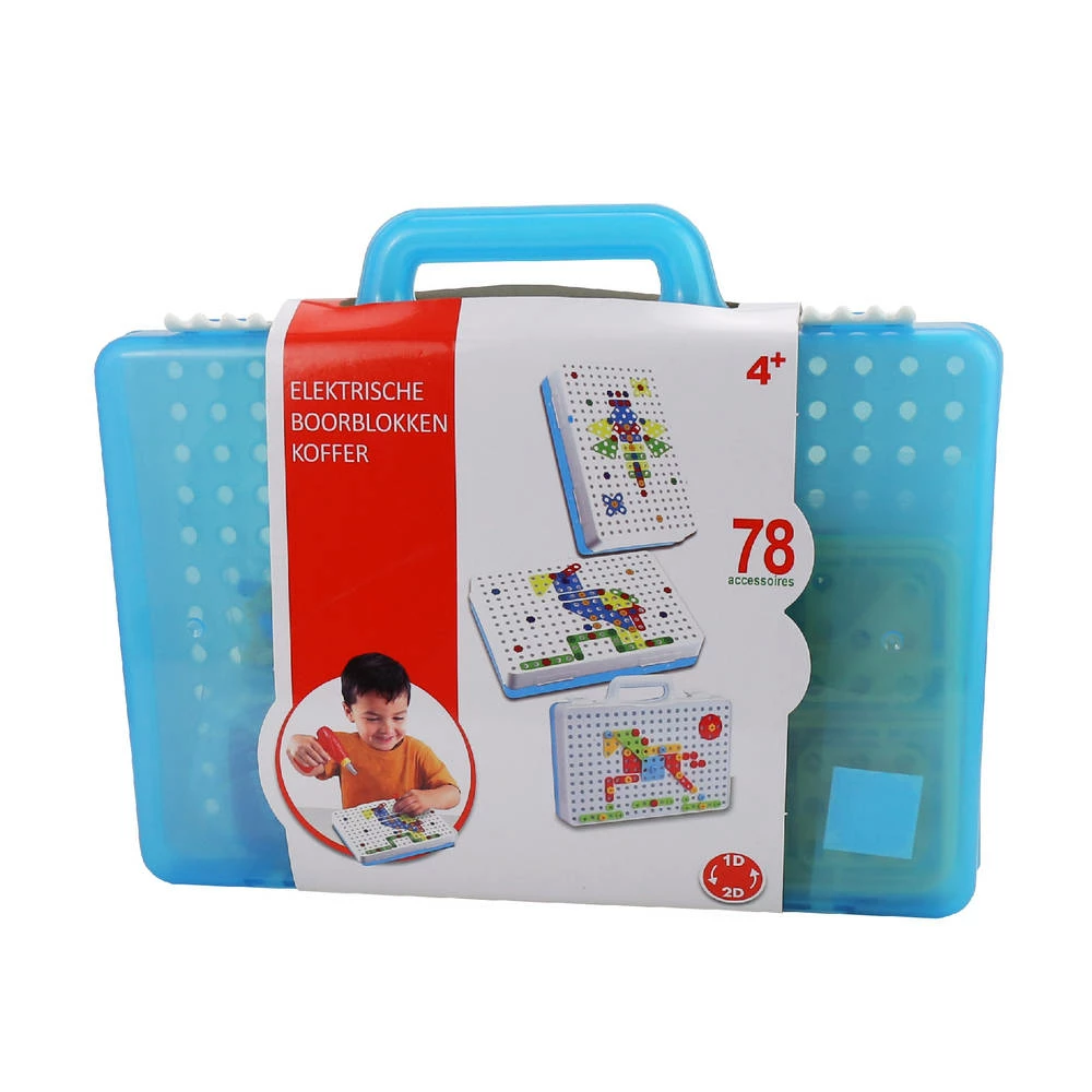 Kleine bouwvakkers kunnen deze elektrische boorblokkenkoffer op de bouwplaats goed gebruiken. In de koffer zitten een elektrische boormachine, 30 stuks schroeven en 48 blokken. Je hebt de schroeven in vijf kleuren, van elk zes stuks. De blokken heb je in vier vormen en vier kleuren.