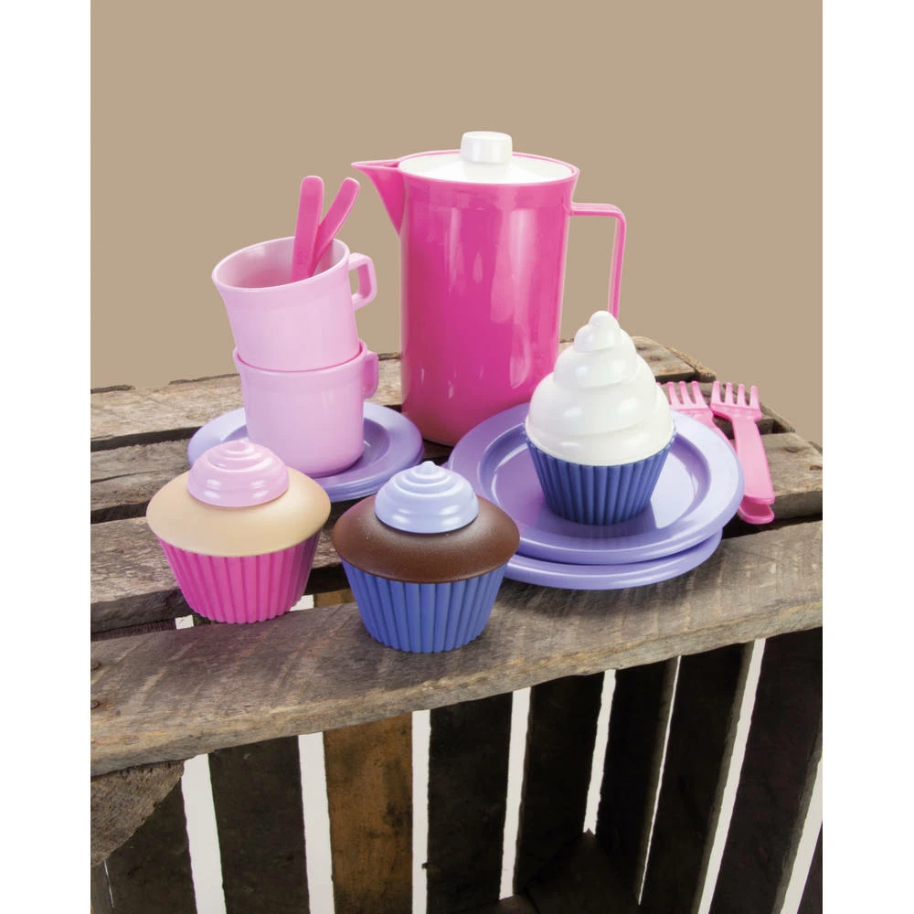 - De set bestaat uit een koffiekan, cupcakes, bordjes, bestek en meer.