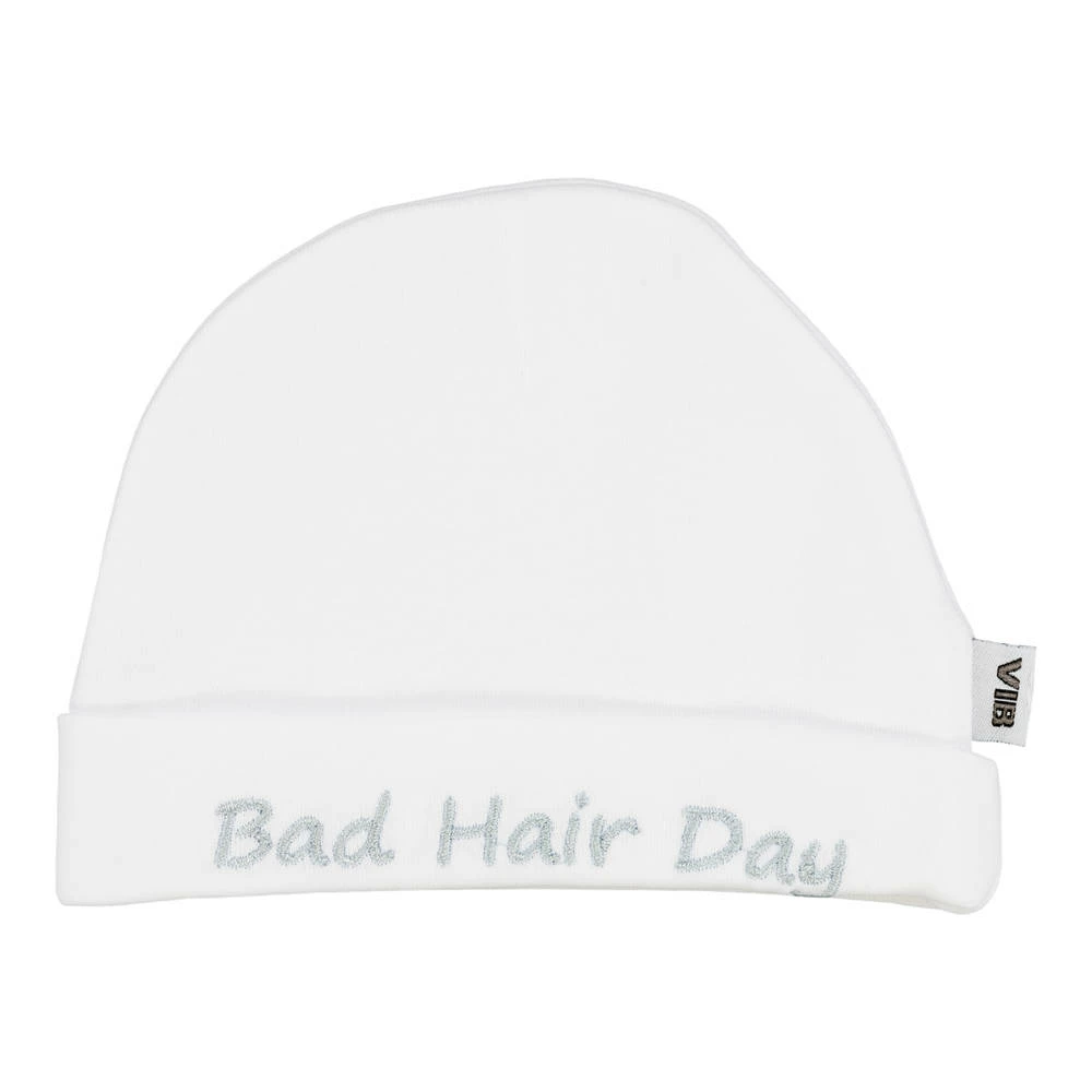Deze witte VIB bad hair day ronde muts houdt het hoofdje van je kind altijd warm. De woorden ‘bad hair day’, staan erop geborduurd.