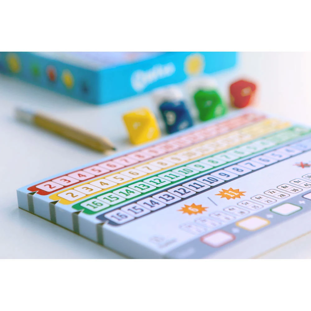 - Qwixx Longo bevat lange getallenrijen, 8-zijdige dobbelstenen en voor iedere speler twee unieke geluksgetallen.