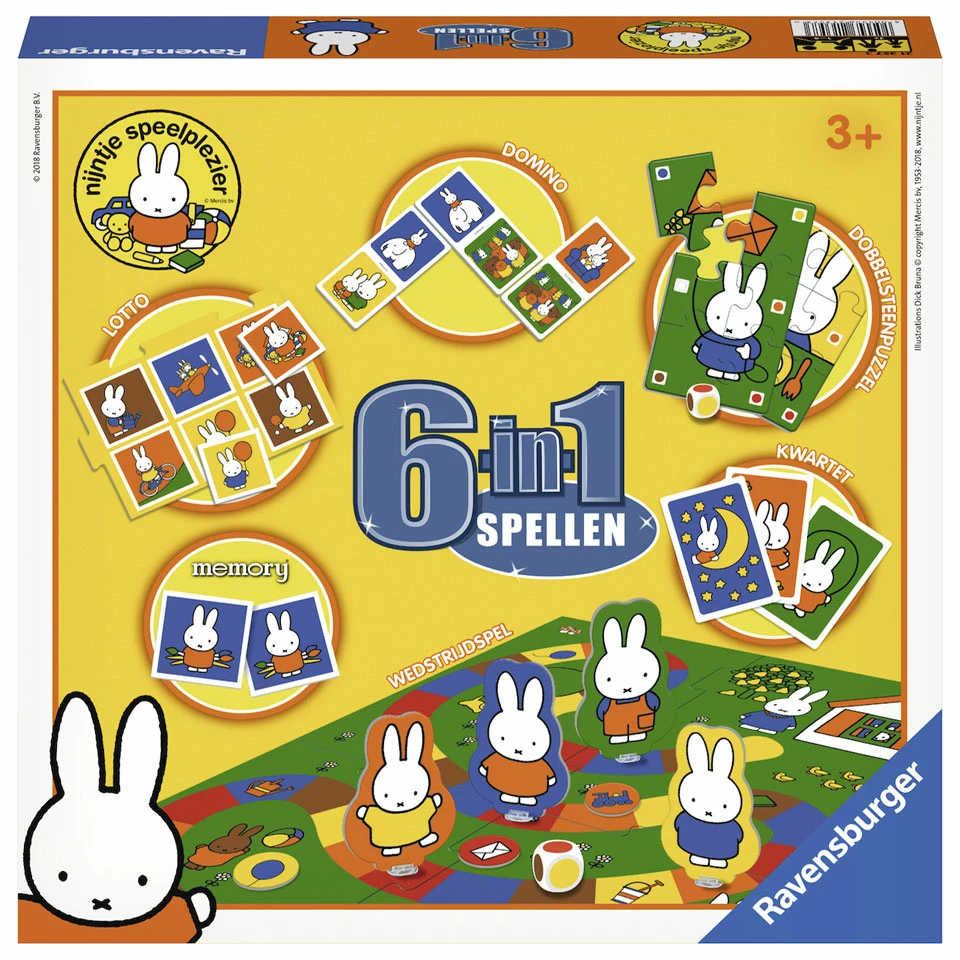 Spellen spelen wordt nog leuker met Nijntje en haar vriendjes. Deze Ravensburger spellendoos bevat zes verschillende spelklassiekers in Nijntje thema.