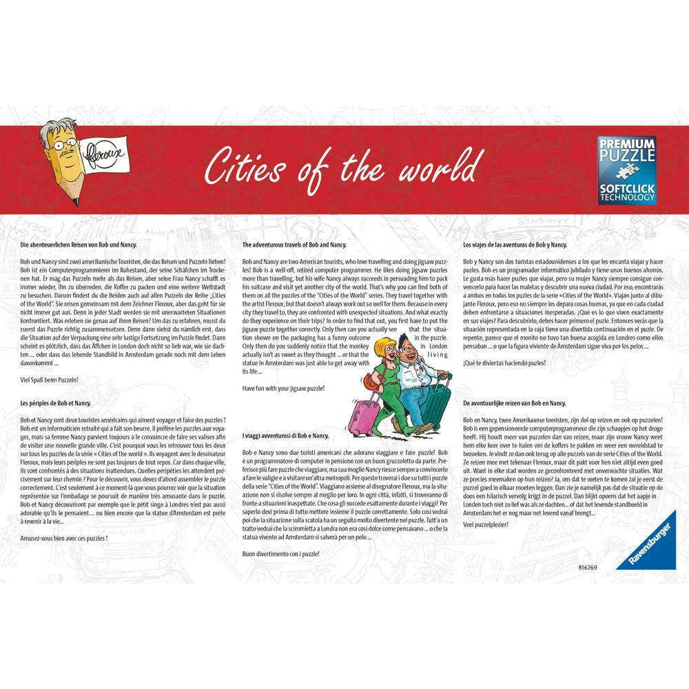 Zal je het lukken om deze Ravensburger Rotterdam puzzel helemaal te leggen? De Wereld Haven Dagen in Rotterdam is het jaarlijks terugkerende festival waar iedereen die ook maar iets met de haven of scheepvaart van doen heeft zich van zijn beste kant wil laten zien. De Koninklijke Marine is er met zijn oorlogsschepen, het havenbedrijf komt met blusboten en een drijvende kraan. De chaos wordt compleet gemaakt door het publiek dat niet alleen de boel onveilig maakt op de Kop van Zuid, maar ook op watertaxi’s, een rondvaartboot en natuurlijk op het reusachtige cruiseschip waar een iets te dikke dame geheel klem zit in de glijbaan. En de vaste gasten Bob en Nancy doen ook een duit in het zakje! Hun aandeel in de chaos zie je als je de puzzel hebt gemaakt. De puzzel bestaat uit 1000 stukjes.