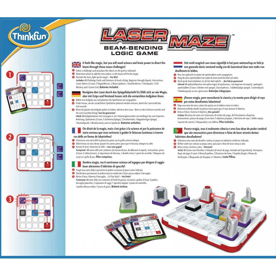 Laser Maze is een geweldig logicaspel voor één persoon met lichten en spiegels. Het voelt wel magisch aan, maar eigenlijk is het pure wetenschap en heb je een gezonde dosis verstand nodig om de laserstraal door een reeks van doolhoven te leiden. Dit leuke denkspel bevat 60 uitdagingen die op een makkelijk niveau beginnen en naarmate je verder komt steeds moeilijker worden. Maak je klaar voor een flinke mentale training en kies een opdracht. Het doel is om uiteindelijk met je laser het doel te raken!