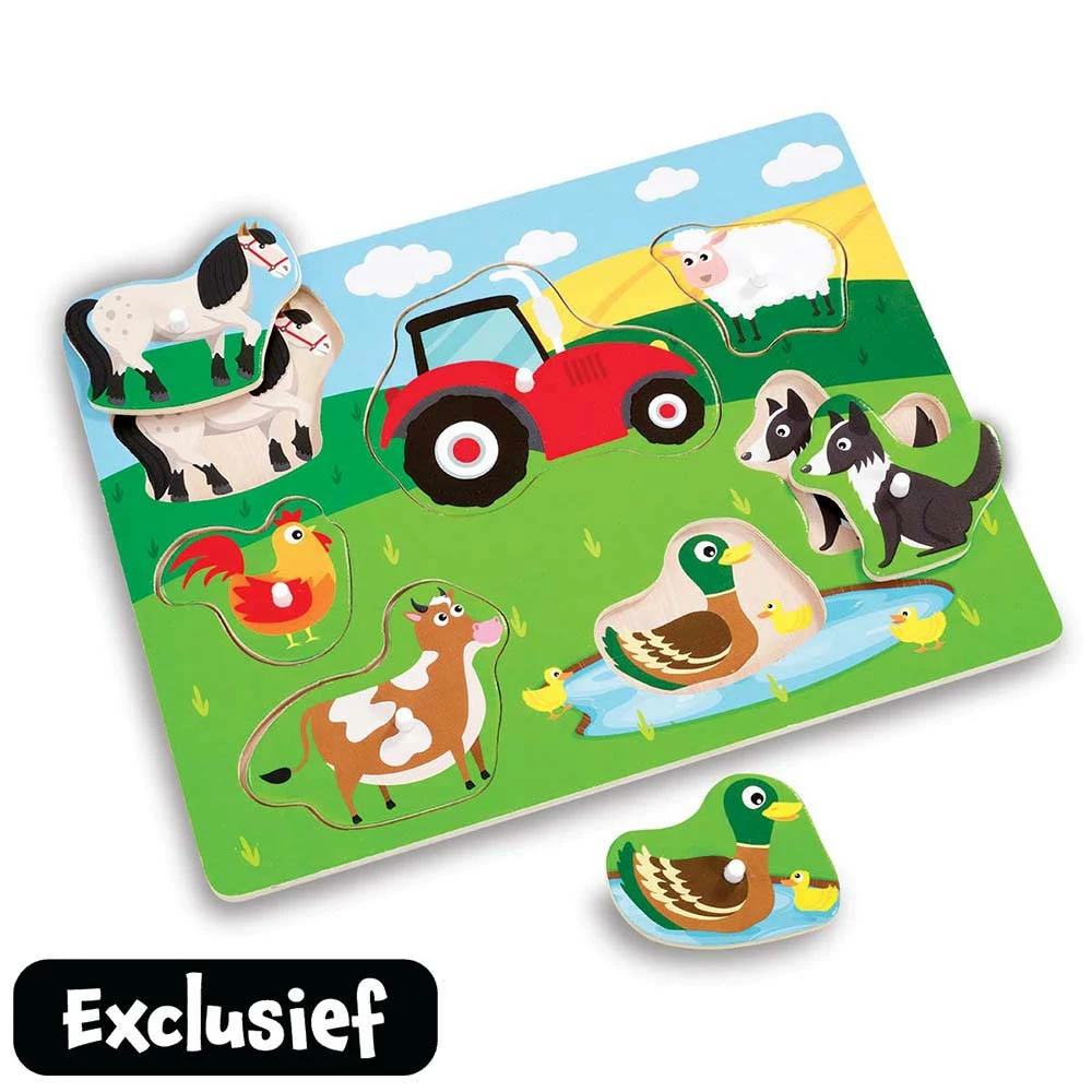 Je kleuter leert met deze houten puzzel alles over het leven op de boerderij. Met zeven gemakkelijk vast te pakken houten puzzelstukken om in de juiste gleuven terug te plaatsen, leert je kind de namen van de dieren. De puzzel helpt hun coördinatie en behendigheid als ze de koe, het schaap, het paard, de hond, de eend en de tractor op de juiste plaats te zetten door de stukken in de gleuven in de puzzelbasis te plaatsen.