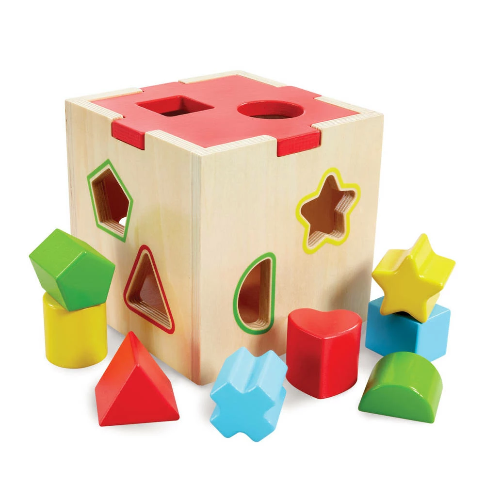 - Druk de kleurrijke vormen door het corresponderende gevormde en gekleurde raam in de houten kubus.